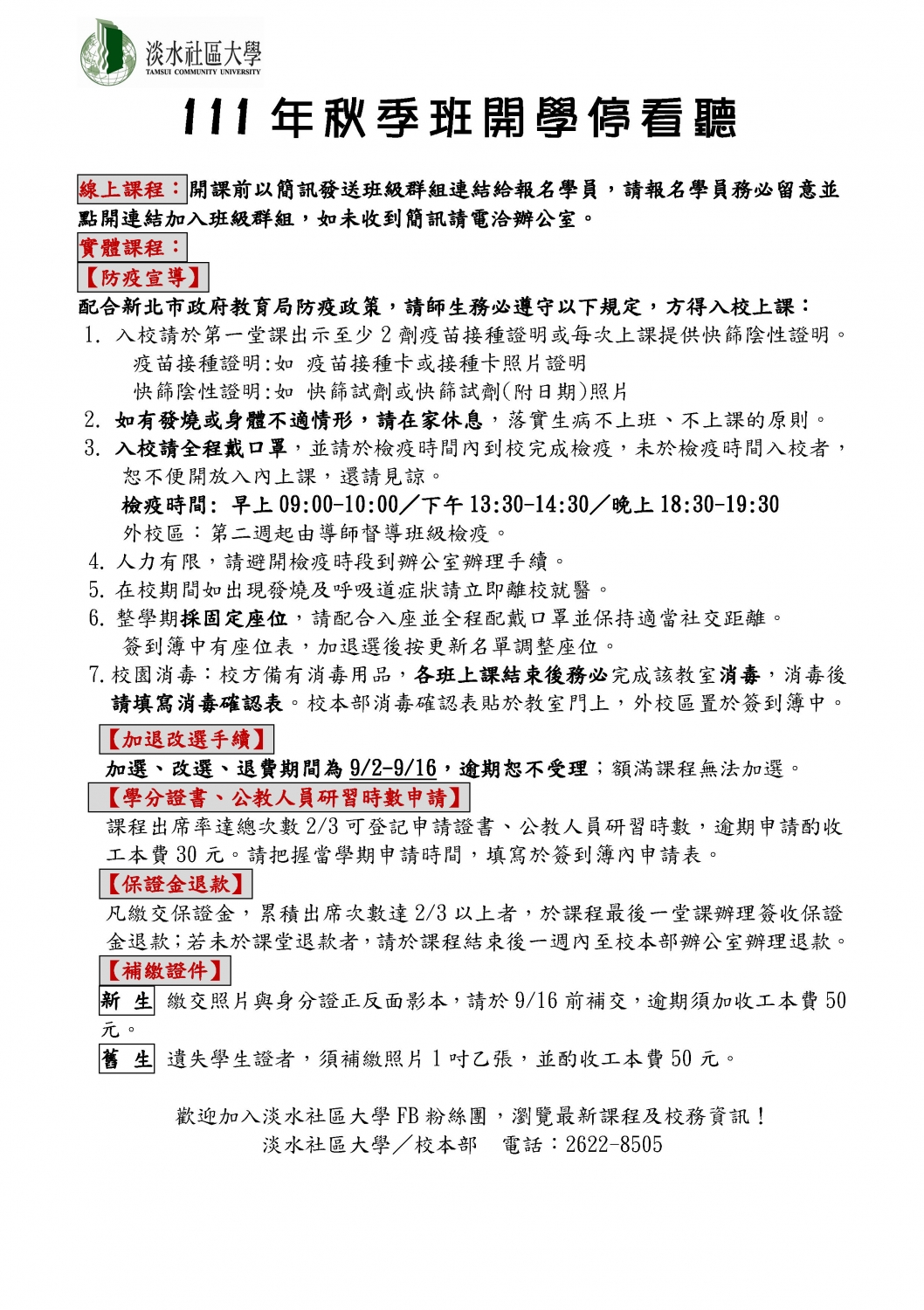 2022/9/1111年秋季班開學注意事項