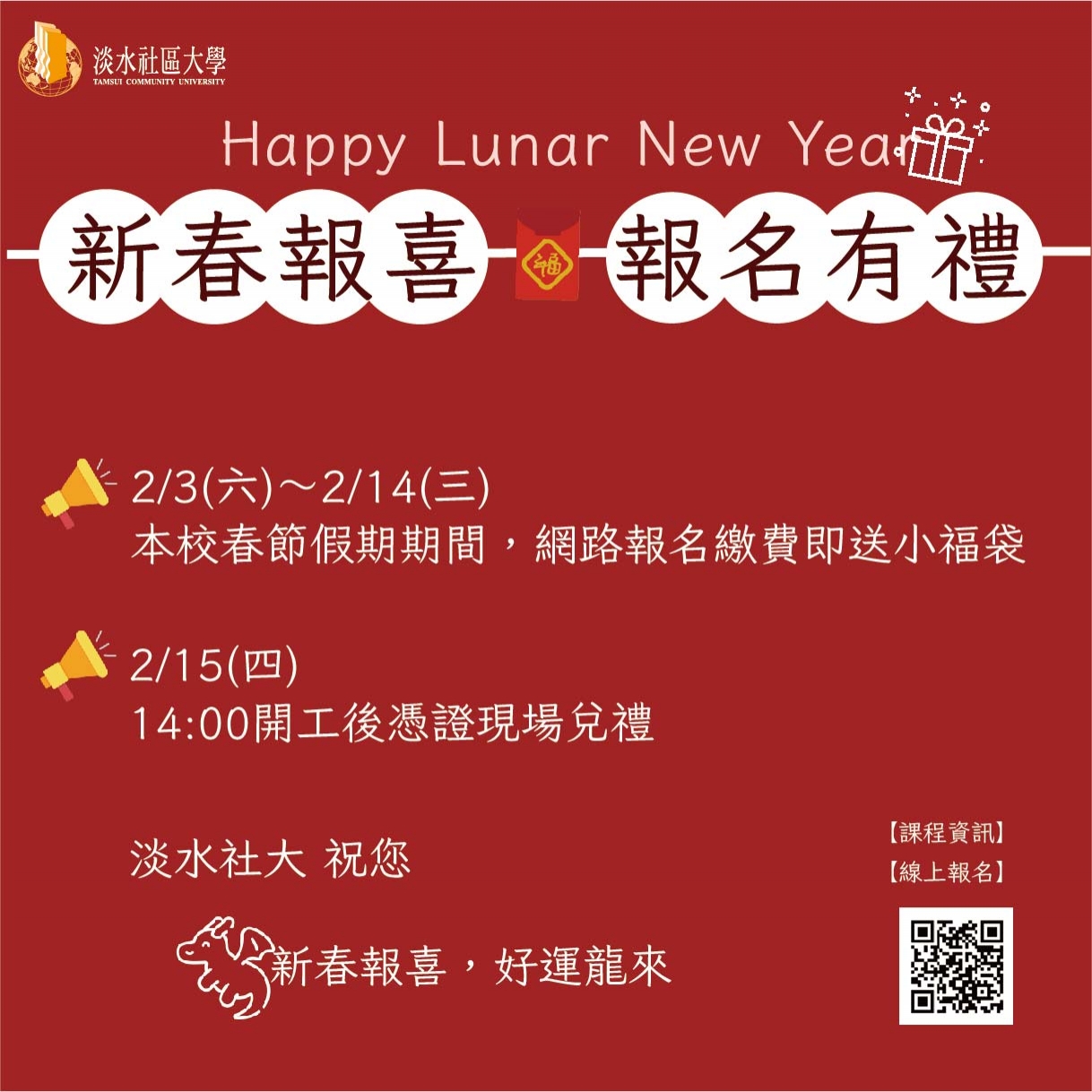 2/3-2/14 淡水社大春節假期,辦公室暫停開放,歡迎網路報名繳費,新春小禮2/15社大開工後送給您﹗